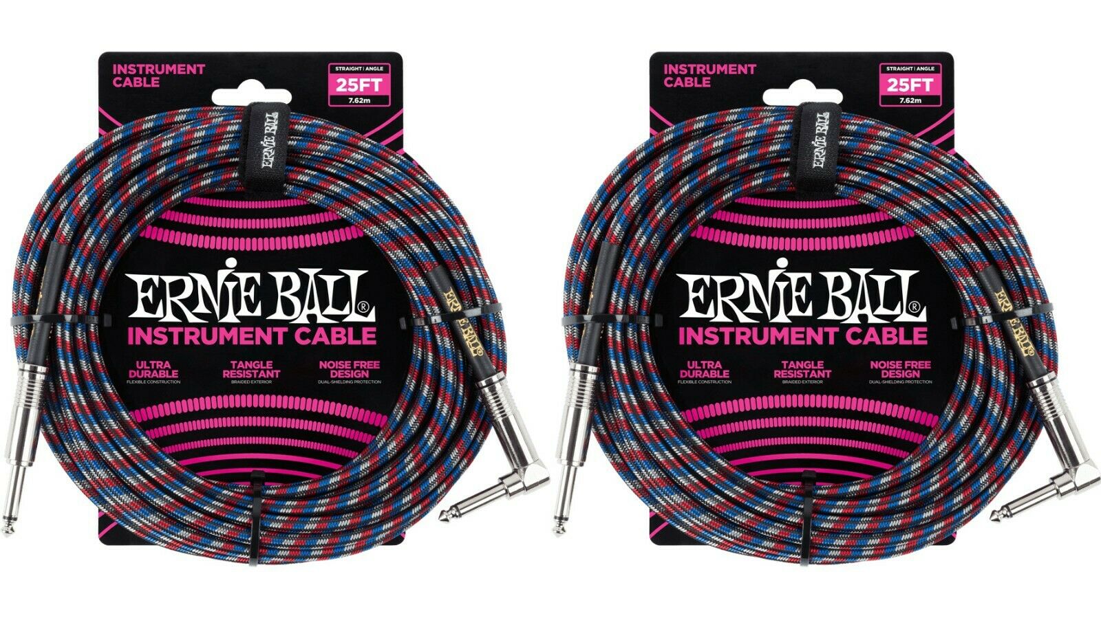 Ernie Ball 25ft Braided Straight Angle Inst Cable Black Red Blue White 2 Pack